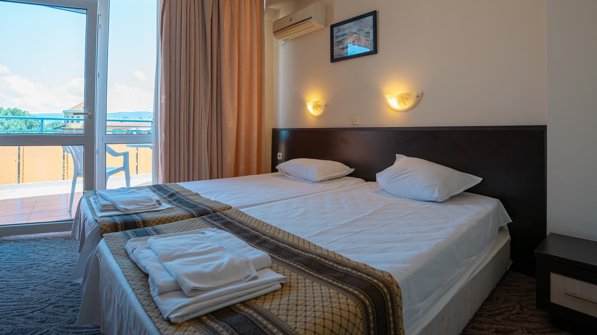 Værelserne på Amaris er lyse, rummelige og indrettet med fokus på både komfort og funktionalitet. Alle værelser har aircondition, satellit-tv, eget badeværelse og privat balkon, hvor I kan slappe af efter en dag ved poolen eller en aften i byen.