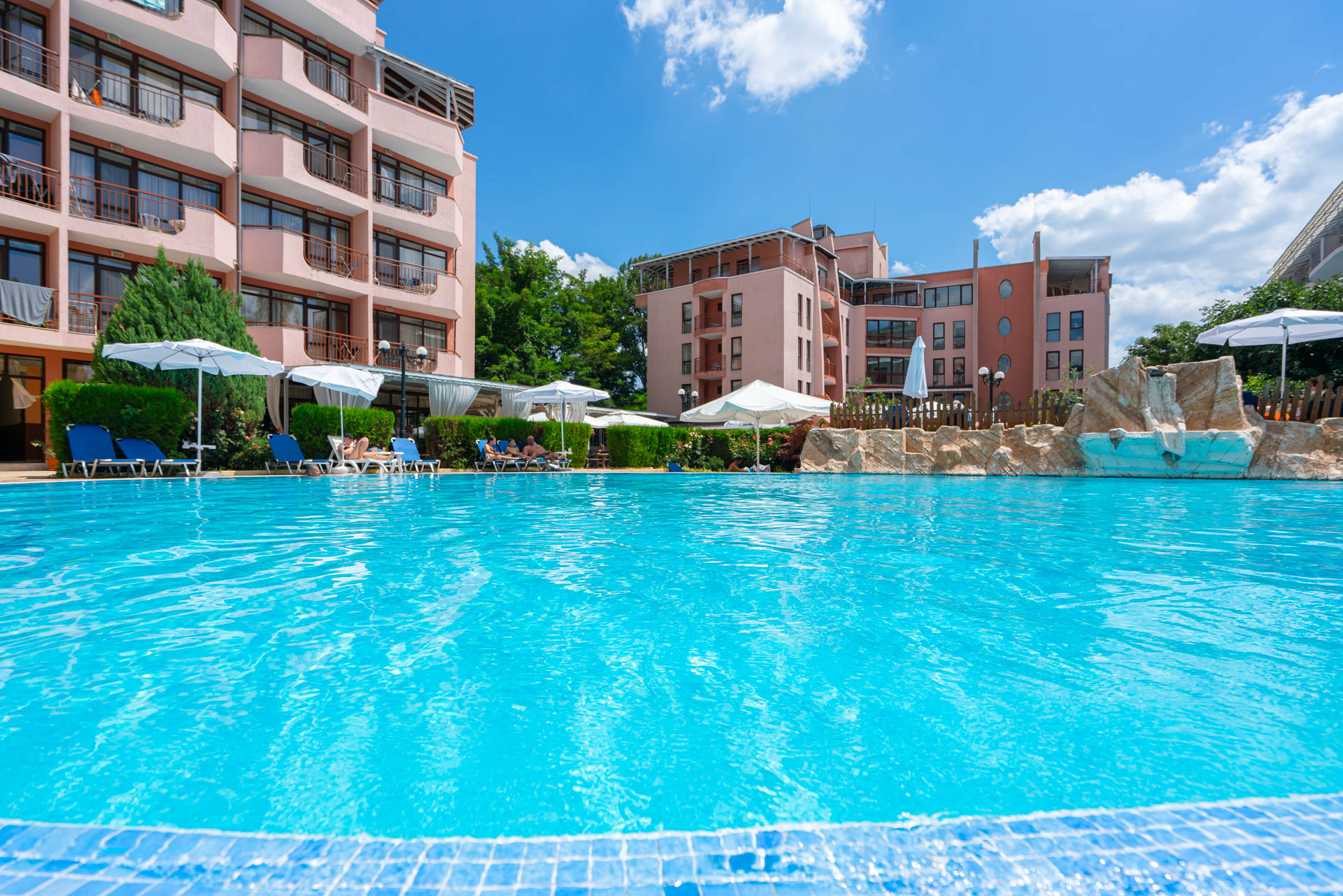 Hotellet har et stort poolområde med liggestole, parasoller og en poolbar, hvor du kan nyde kolde drikke og snacks i løbet af dagen. Stemningen er afslappet og livlig, og her samles gæsterne for at nyde solen og skabe ferieminder sammen. Der er også en hyggelig lobbybar og et mindre fitnessrum til dig, der gerne vil holde formen ved lige under ferien.