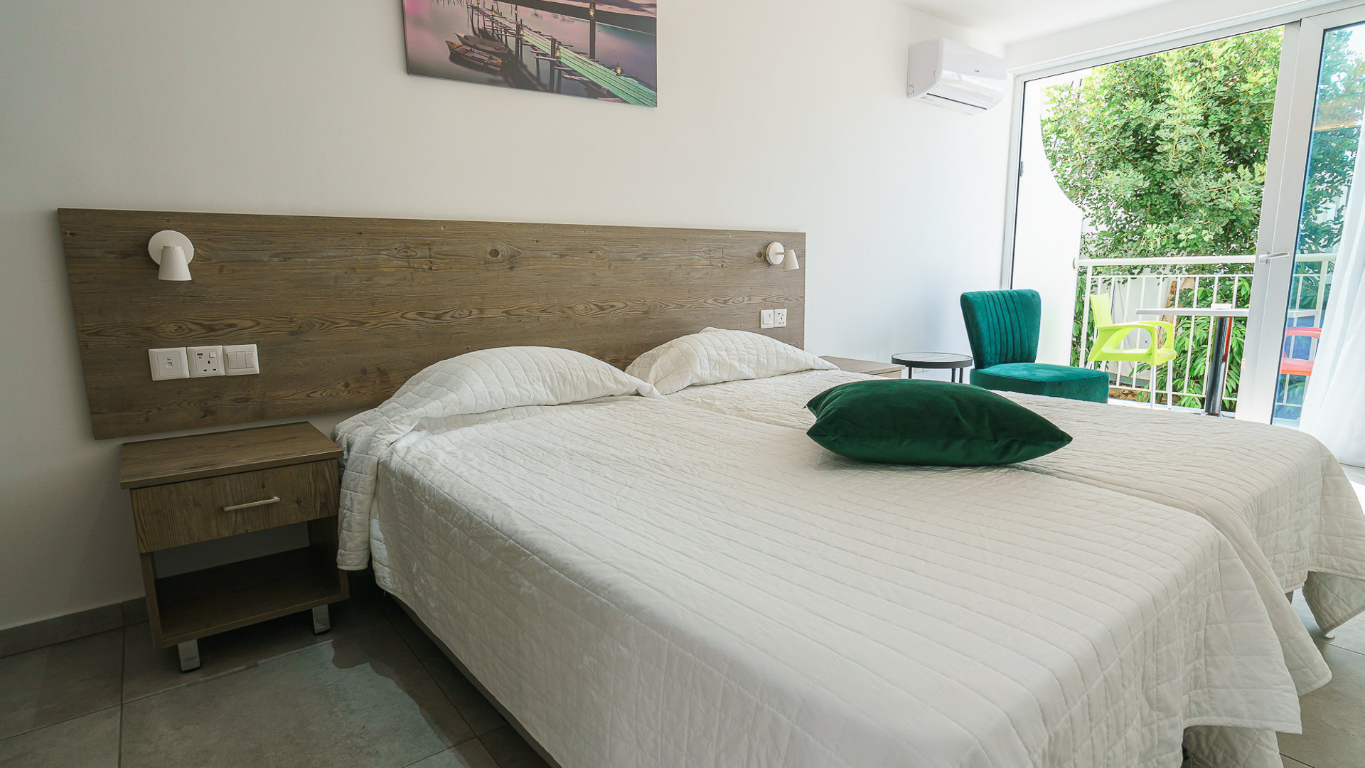 Alle lejligheder på Hotel Pavlinia blev renoveret i 2023–2024 og fremstår moderne, lyse og rummelige. De har plads til 2–6 personer og er indrettet med balkon, tekøkken, spiseplads samt eget bad og toilet. Her har du alt, hvad du behøver for en komfortabel ferie i Ayia Napa.